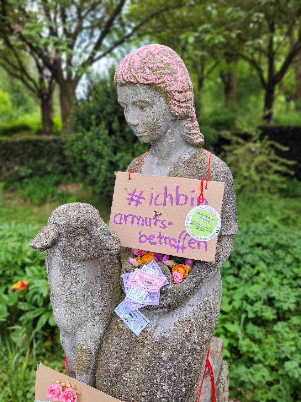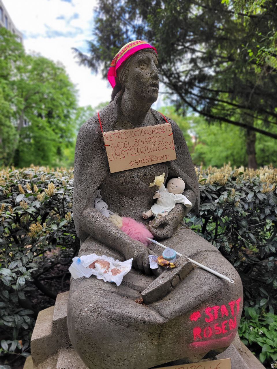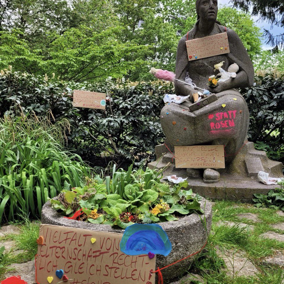 Im Volkspark Mariendorf einem typischen Berliner Stadtteilpark, der in Zeiten der zunehmende Industrialisierung Berlins zur Naherholung geschaffen wurde, findet sich passend zu unserem diesejährigen Motto #stattRosen ein Rosengarten, der von 4 Kinderskulpturen gesäumt wird. Diese Kinderskulpturen wurden im Rahmen unserer Aktion zum Muttertag umgestaltet. Die Statuen sensibilisieren so einerseits für das Thema Kinderarmut und Armut von FLINTAS durch die ungleiche Verteilung von unbezahlter Care-Arbeit und tragen andererseits stellvertretend für die Kinder und Familien, die in Deutschland in Armut leben müssen politische Forderungen in die Öffentlichkeit.