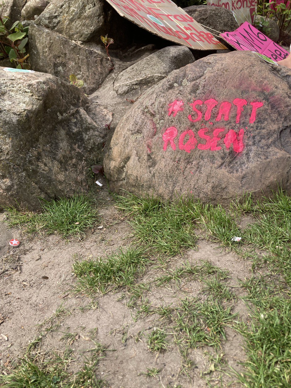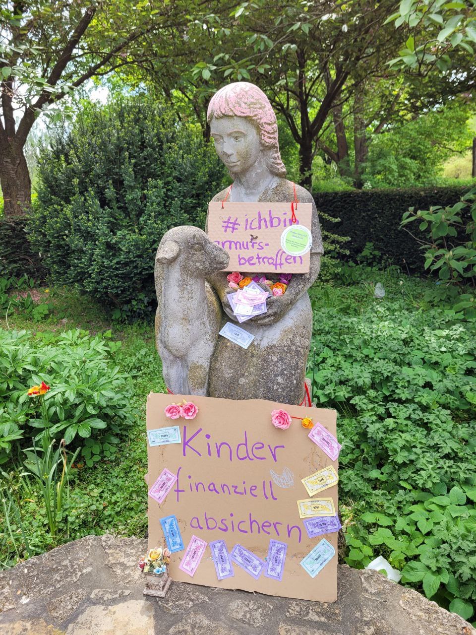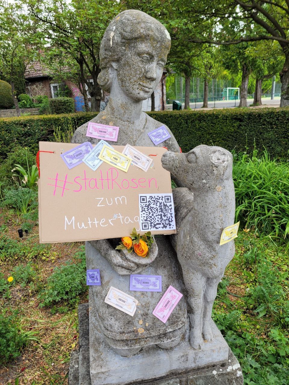 Im Volkspark Mariendorf einem typischen Berliner Stadtteilpark, der in Zeiten der zunehmende Industrialisierung Berlins zur Naherholung geschaffen wurde, findet sich passend zu unserem diesejährigen Motto #stattRosen ein Rosengarten, der von 4 Kinderskulpturen gesäumt wird. Diese Kinderskulpturen wurden im Rahmen unserer Aktion zum Muttertag umgestaltet. Die Statuen sensibilisieren so einerseits für das Thema Kinderarmut und Armut von FLINTAS durch die ungleiche Verteilung von unbezahlter Care-Arbeit und tragen andererseits stellvertretend für die Kinder und Familien, die in Deutschland in Armut leben müssen politische Forderungen in die Öffentlichkeit.