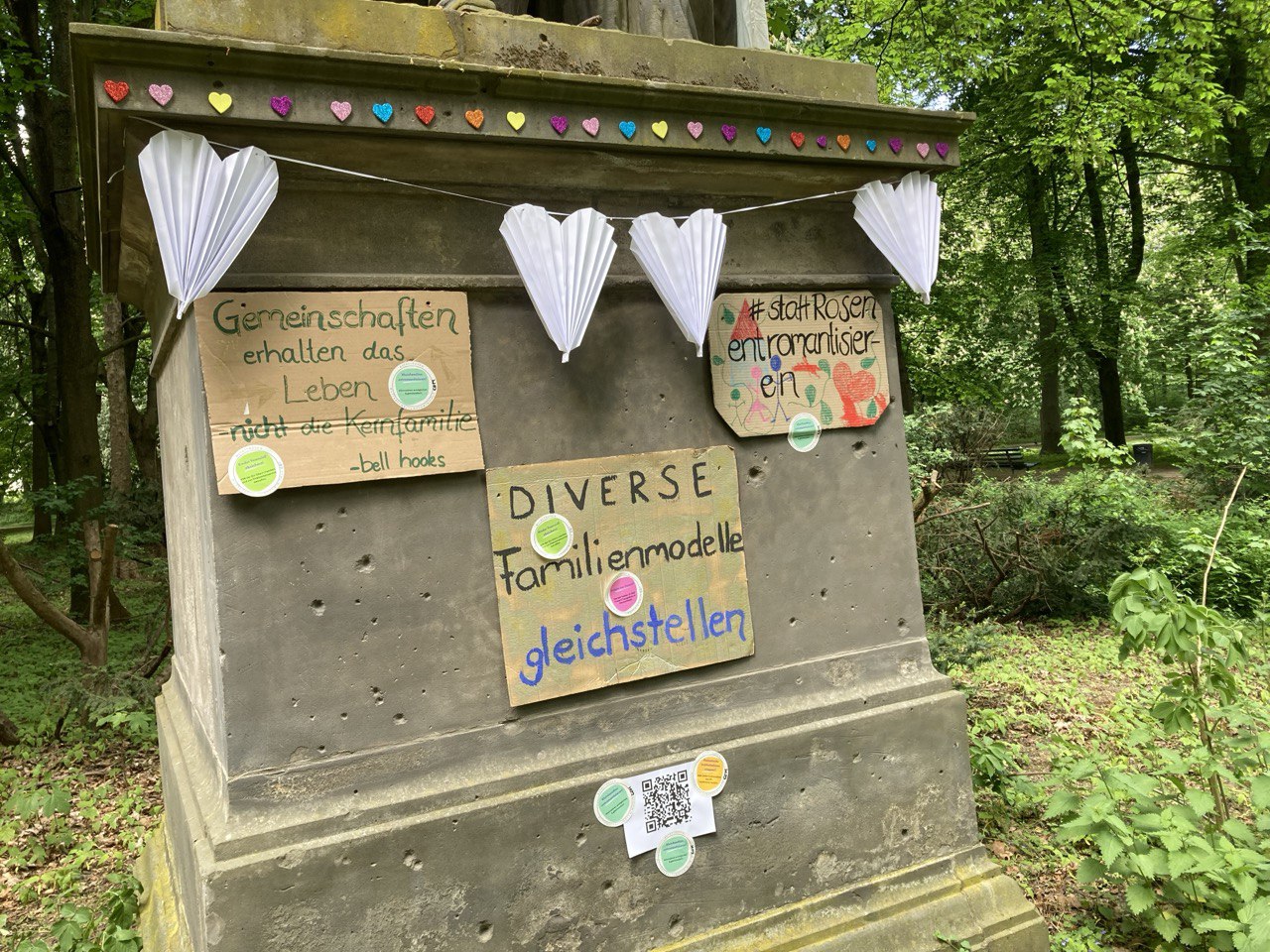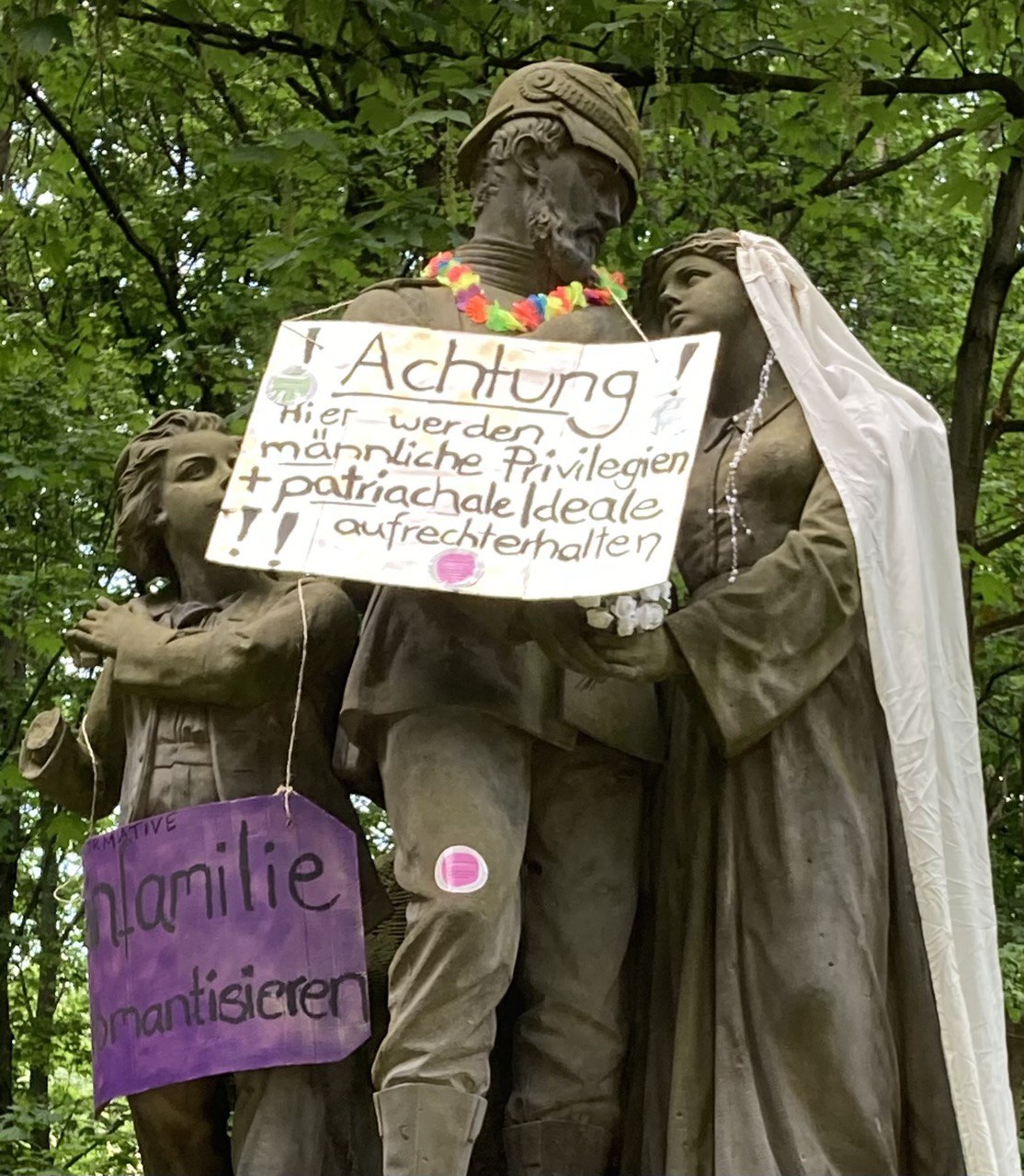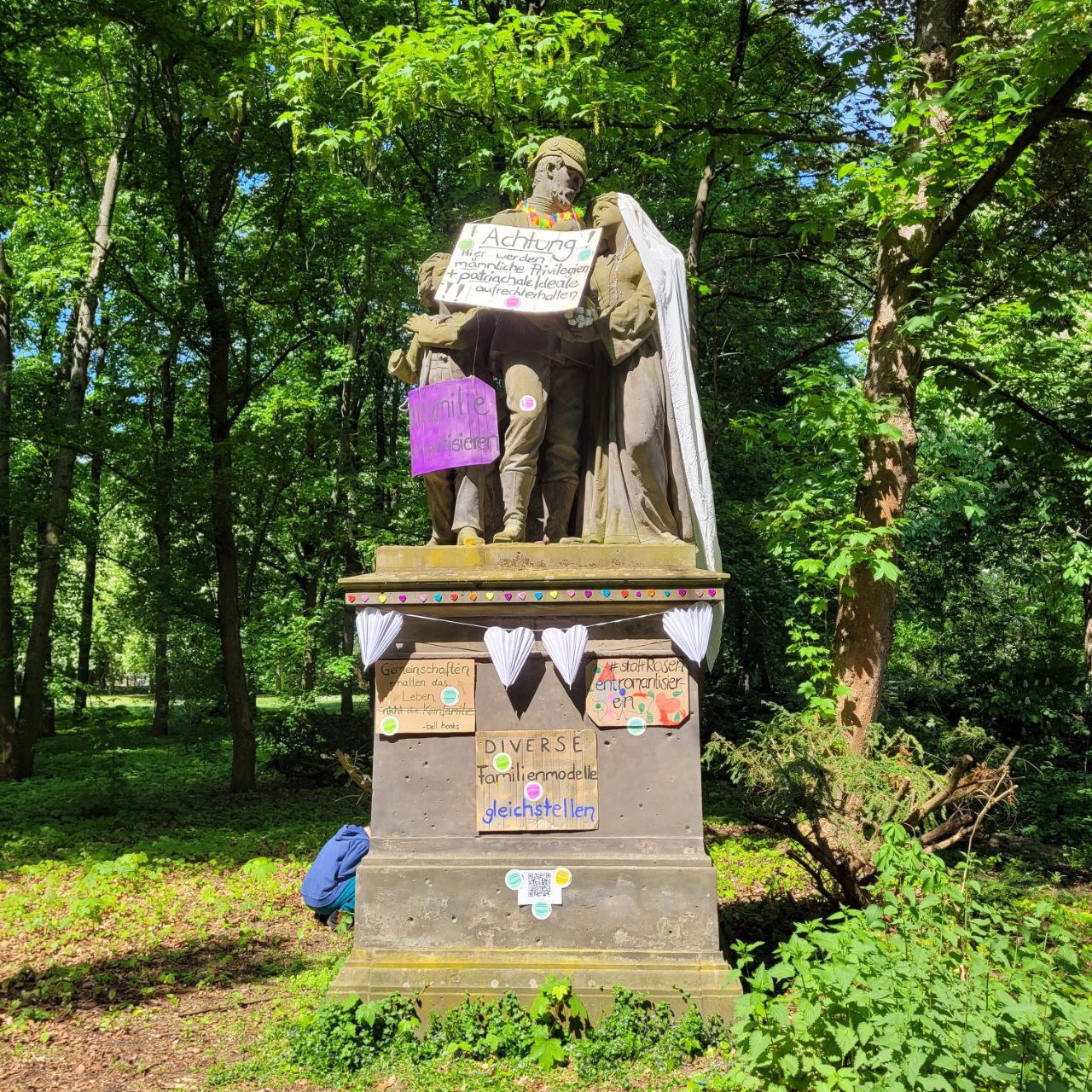 Aus unserer Sicht stellt die Statue: „Der Abschied des Kriegers“, gestaltet von einem cis-Mann, eine ideale, heteronormative Kleinfamilie als glücklicher und heiler Ort dar, der dem Krieg als Schauplatz von Gewalt gegenüber steht. In der Statue ist eine hierarchische, patriachale Anordnung der Personen sichtbar- der Blick von der hingebungsvollen und liebenden Frau und des als männlich gelesenen Kindes hoch zum Vater, der hier als Oberhaupt dargestellt wird und als nach außen hin handelnder und sichtbarer Mann agiert. Es wird deutlich, dass hierdurch eine Idealisierung einer Kleinfamilie für patriachale Zwecke inszeniert wird. Mit der Umgestaltung der Statue wollen wir unsere Kritik an der bis heute andauernden Romantisierung vder heteronormativen Kleinfamilien als gesellschaftliches Ideal in die Öffentlichkeit tragen.