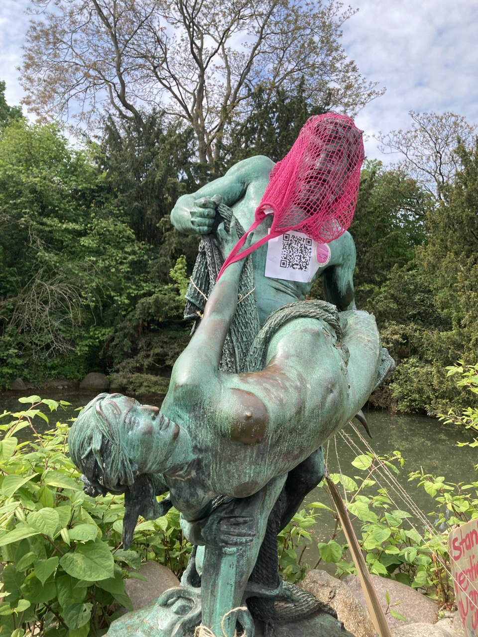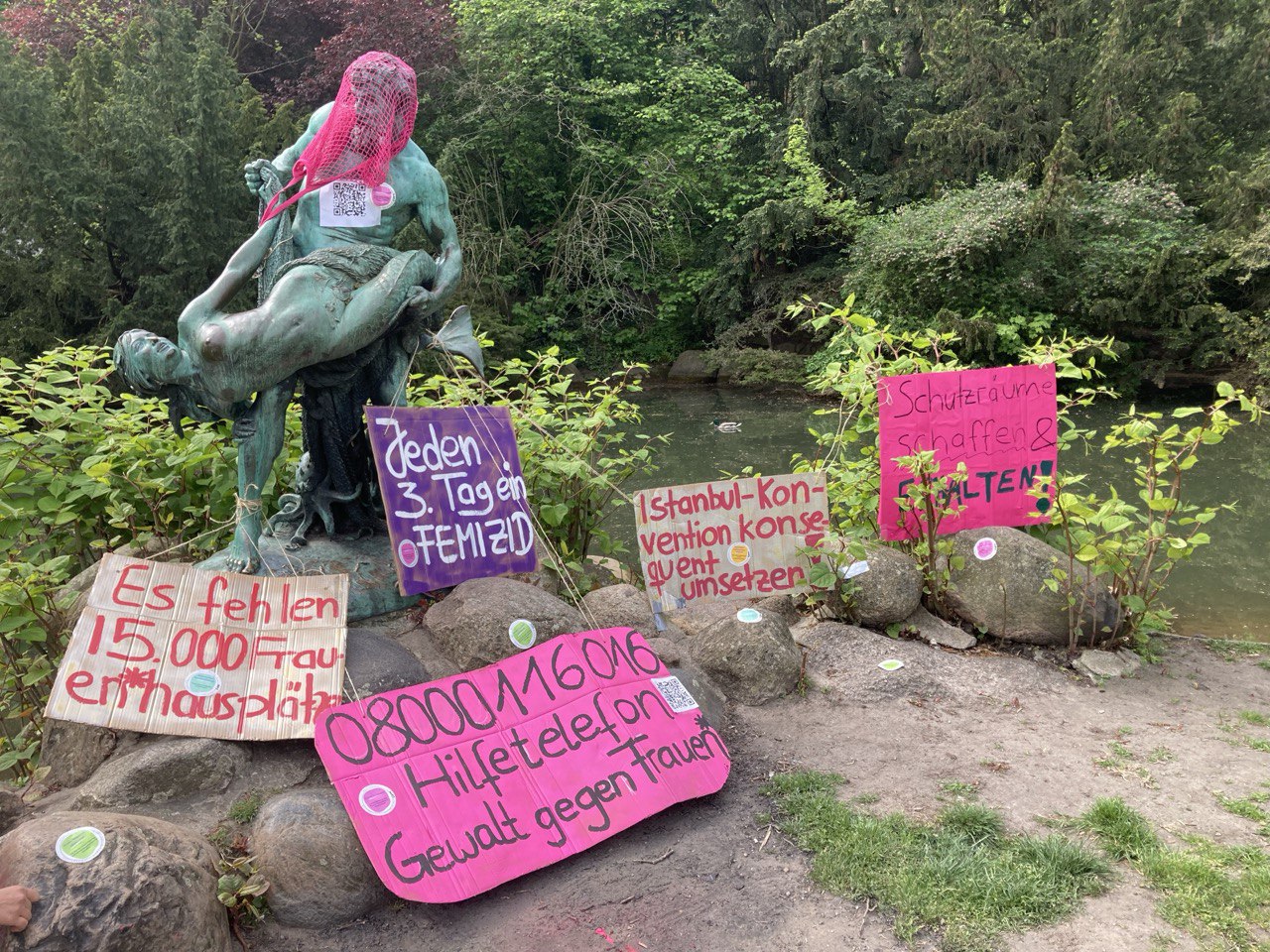 Am Fuße des Wasserfalls am großen Teich des Victoriaparks steht seit 1896 die Bronzeskulptur mit dem obszönen/geschmacklosen Titel „Der seltene Fang“ von Ernst Herter. Die Skulptur stellt eine Nixe dar, die sich im Netz eines Fischers verfangen hat – ihm, so scheint es, wehrlos ausgeliefert. Er steht machtdemonstrierend über ihr. Zu Recht hat sich zu dieser Skulptur seit Kurzrm eine Debatte entfacht – zeigt sie doch auf verharmlosende Weise eine Form von sexualisierter Gewalt. Daher schien es uns nur passend diesen Ort zu wählen, um unsere Forderungen und Fakten zu Gewalt gegen FLINTA* öffentlich wirksam zu platzieren.