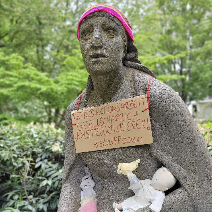Wir bespielen dieses Jahr verschiedene Plätze und Denkmäler in Berlin und tragen so unsere Forderungen in den Stadtraum. Die Forderungen betreffen sechs Themenkomplexe: Sorgearbeit, Existenzsicherung, reproduktive Gerechtigkeit, Kritik am Ideal der Kleinfamilie, geschlechtsspezifische Gewalt und unsicheren Wohnraum. Sie sind miteinander verwoben und können nicht getrennt betrachtet werden, denn sie bilden den Boden, auf dem unsere patriarchale, kapitalistische Gesellschaft steht.